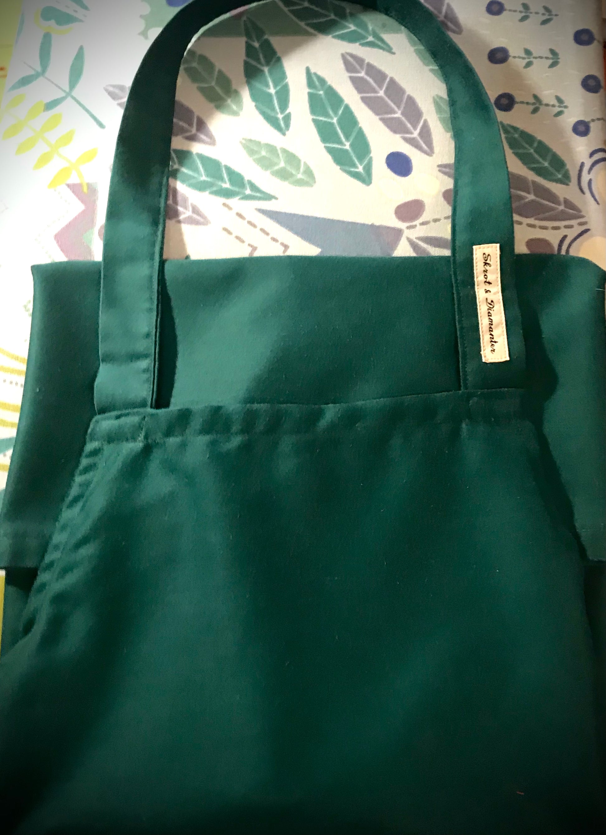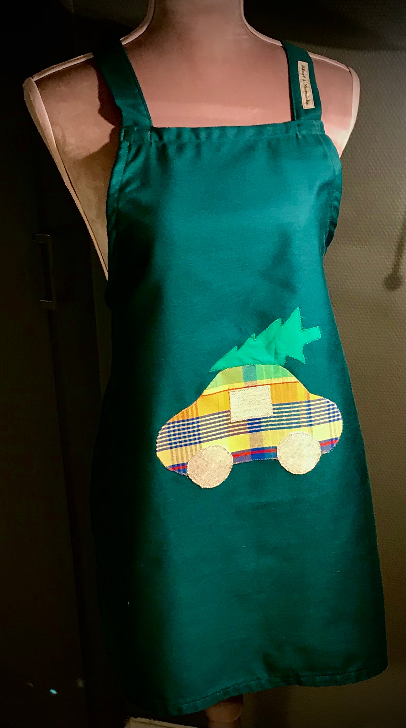En skjønn, grønn juleduk er oppgradert til barneforklær. Julemotiv med bil og juletre på taket. Forkleet med dette julemotivet finnes i to eksemplarer. Lokalprodusert av gjenbrukstekstil i god kvalitet.