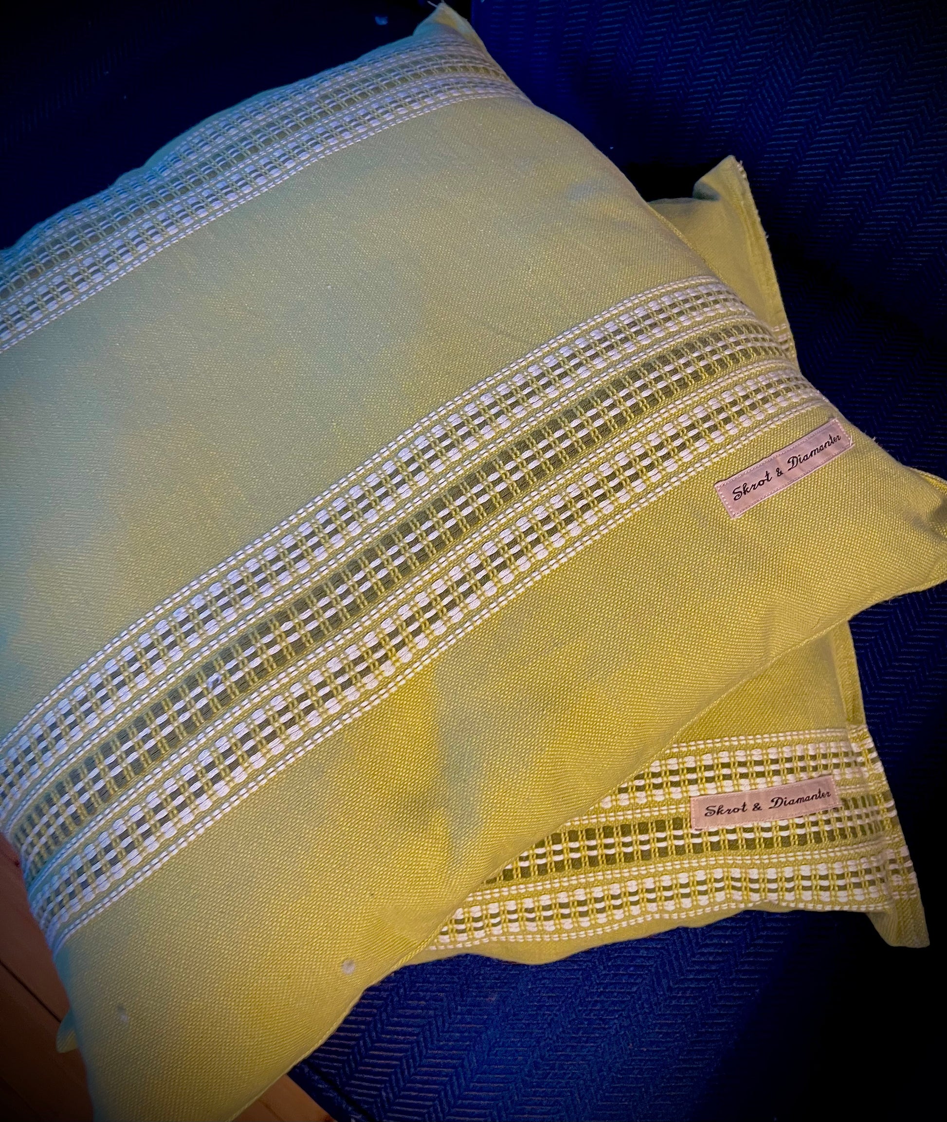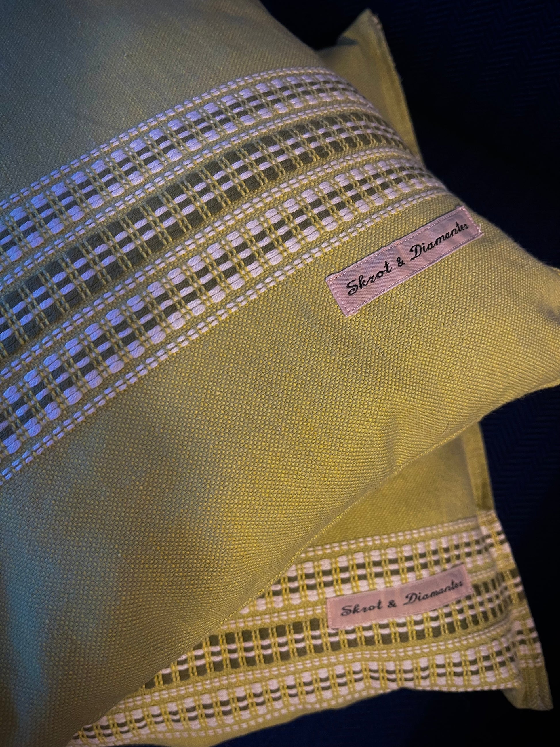 Putene er sydd i Norge, av mormors kvalitetsgardiner og er fylt med herlig, myk fiber av bomull og polyester. Putefyllet er utvunnet av fiberproduksjonen til Norsk Tekstil Gjenvinning, på initiativ fra Skrot & Diamanter.